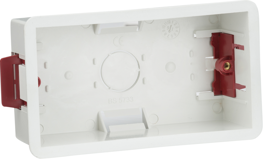 White, plastic dry lining box. For mounting electrics into dry-lined cavity walls.