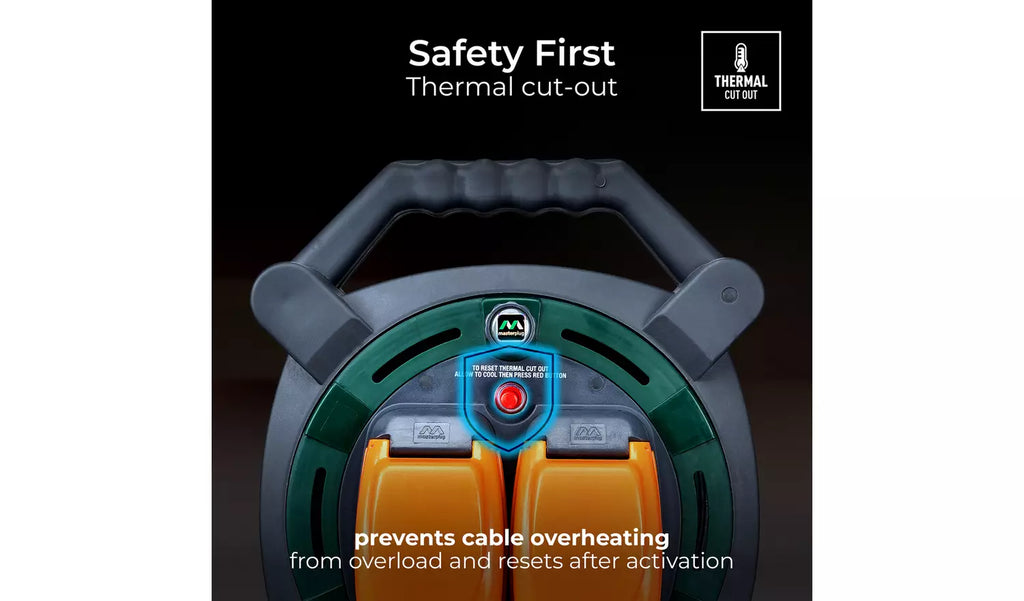 This Masterplug weatherproof cable reel is the perfect solution to your outdoor power needs enabling you to safely perform a variety of DIY tasks. Premium features including two sealable socket covers prevent water ingress, a high-vis cable helps to prevent cable cut-through and tripping, and a resettable thermal cut-out reduces the risk of overload when fully unreeled. The easy wind extendable handle allows for easy retraction after use and the durable case protects the cable when used or transported providing peace of mind whilst you work.